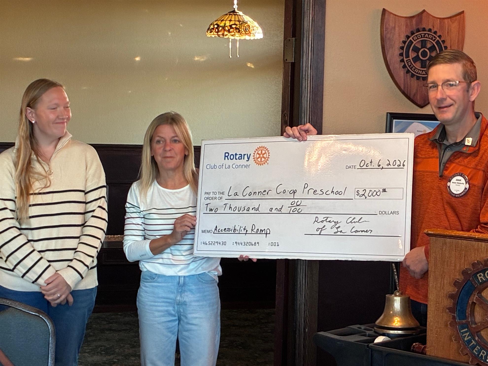 Adam announced $2,000 to the La Conner Co-op Preschool for their 3 ramps and 2 stairways. They serve preschoolers up to age 5.Lori’s son attended when he was 3. Chelsea is the director. Debbie and Chelsea both thanked the club and expressed how wonderful this is for the preschool and thanked Rotary for their ongoing community service.