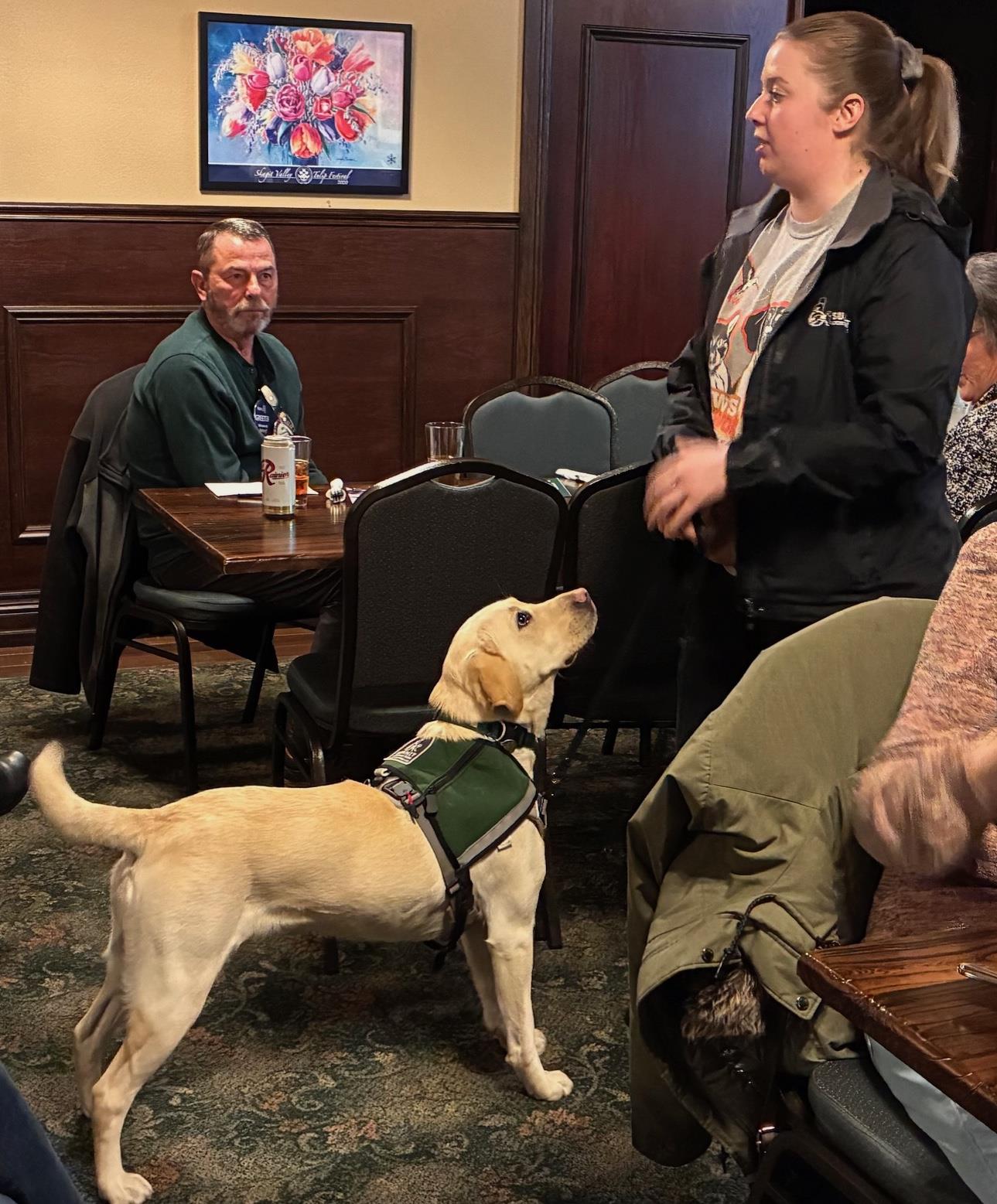 Program from Carlin Padgett from Summit Assistance Dogs with support and demonstration from Heather Anderson, advanced trainer, and Sherry, a yellow labrador retriever.