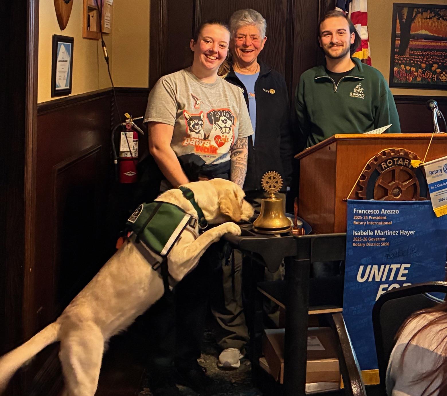 The average wait for a dog is 2-5 years, and at about 2 years of age, dogs are carefully matched with clients. They work together for 6 to 8 years. Then the dog retires from working but can remains as a pet for the client or becomes a pet for someone else. The client is qualified to get a new service dog when their first one retires. While dogs are in service, Summit still owns them and can take them back if they don’t receive proper care. Each dog cost about $50,000 but are provided to clients free so no one ever has to go without a needed mobility service dog because they can’t pay. Summit Assistance gladly accepts individual and service club donations. Our club will plan a visit to the Oak Harbor site.
